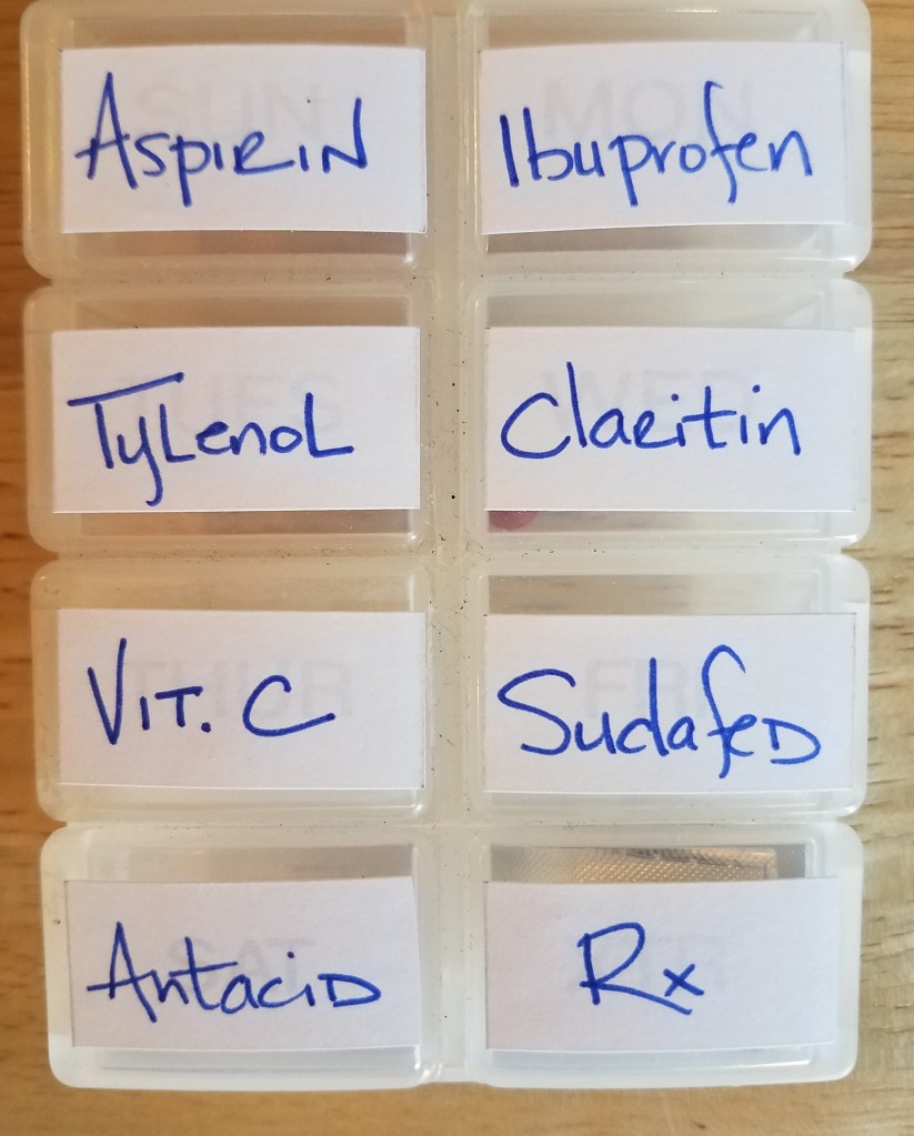 - Medication/Vitamins: Don’t allow a headache or a stuffy nose take you down! To avoid looking like you own a pharmacy, fill up a small pill box of the necessities: ibuprofen, aspirin, antacid, anti-histamine, etc. Label contents over the days of the week. I used file folder labels but masking tape works just as well.